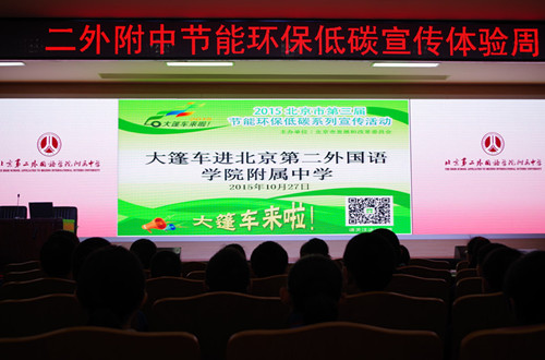 由北京市發(fā)展改革委員會主辦的2015北京市第三屆節(jié)能環(huán)保低碳系列宣傳活動“低碳大篷車”于2015年10月27日走進北京第二外國語學(xué)院附屬中學(xué)。
