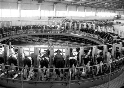 2010年12月10日,奶牛在內蒙古蒙牛集團轉盤式自動擠奶生產線上等待擠奶。