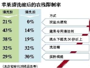 實驗結果:實驗人員介紹,從本次實驗看,鹽水浸泡后再沖洗,蘋果的農(nóng)殘抑制率直接從21%降為零,效果最明顯。其次是專門的果蔬清潔劑,去除農(nóng)殘也還不錯。另外,流水下直接搓洗,也能在一定程度上幫助去除農(nóng)殘。但選用洗潔精以及水中加入面粉揉搓,效果并不明顯。