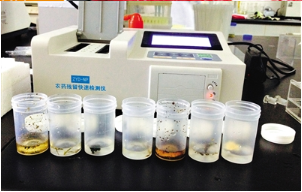 實(shí)驗(yàn)過程:實(shí)驗(yàn)人員分別稱取2克茶葉樣品,加蒸餾水泡開茶葉。然后加農(nóng)殘緩沖溶液、顯色劑、酶試劑等,搖勻靜置10分鐘后放進(jìn)檢測(cè)儀。儀器屏幕上便顯示出農(nóng)殘抑制率數(shù)據(jù)。