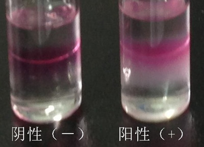 3.樣品檢測(cè):另取一支0.5mL 吸管,吸取試劑C至吸管細(xì)部前端約1/4 處(約0.125mL),插入至試劑B瓶的下層溶液中并緩慢排空,觀察B瓶下層溶液中是否產(chǎn)生渾濁絮狀物或沉淀物。