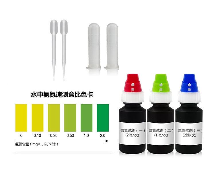 水中氨氮與檢測試劑反應生成藍色物質,含量越高藍色或綠色越深。