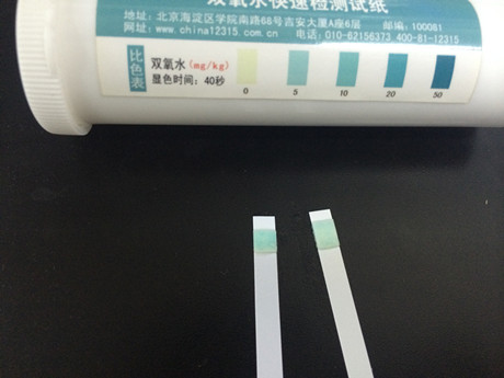 5、由于儀器的雙氧水檢出限為10mg/kg,決定用雙氧水試紙再驗證一下。檢測結果:雙氧水含量在0-5mg/kg之間。