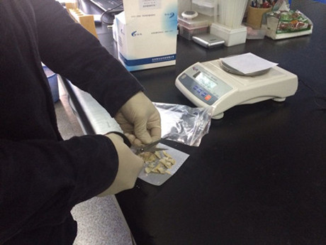 1、稱取剪碎的樣品1.25g至25mL比色管中。
