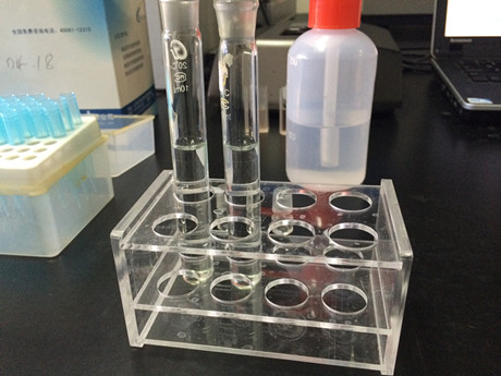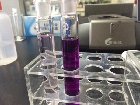 4、取一支10mL比色管,加入1mL樣品液,加入C溶液80μL,加蒸餾水至10mL刻度線,加入D溶液0.5mL,搖勻,開蓋靜置10min。
